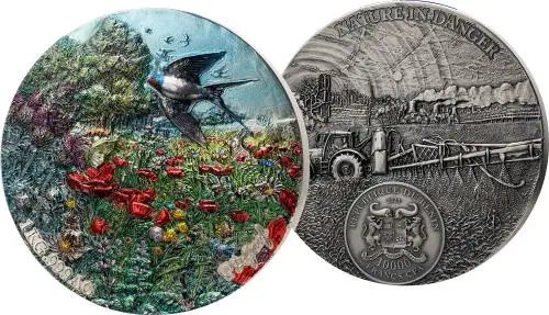 カラフルに彩られた花園の上空を舞うツバメの図柄はコインとして取引するのが惜しくなるほどの芸術性です。