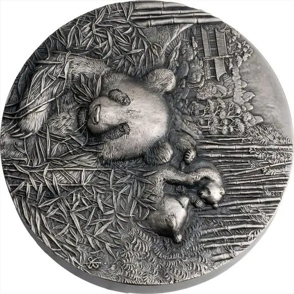 直径20cm、重さ5kgをコインと呼んでよいのか憚れるほどの巨大コインは、ほのぼのとしたジャイアントパンダの図柄です。